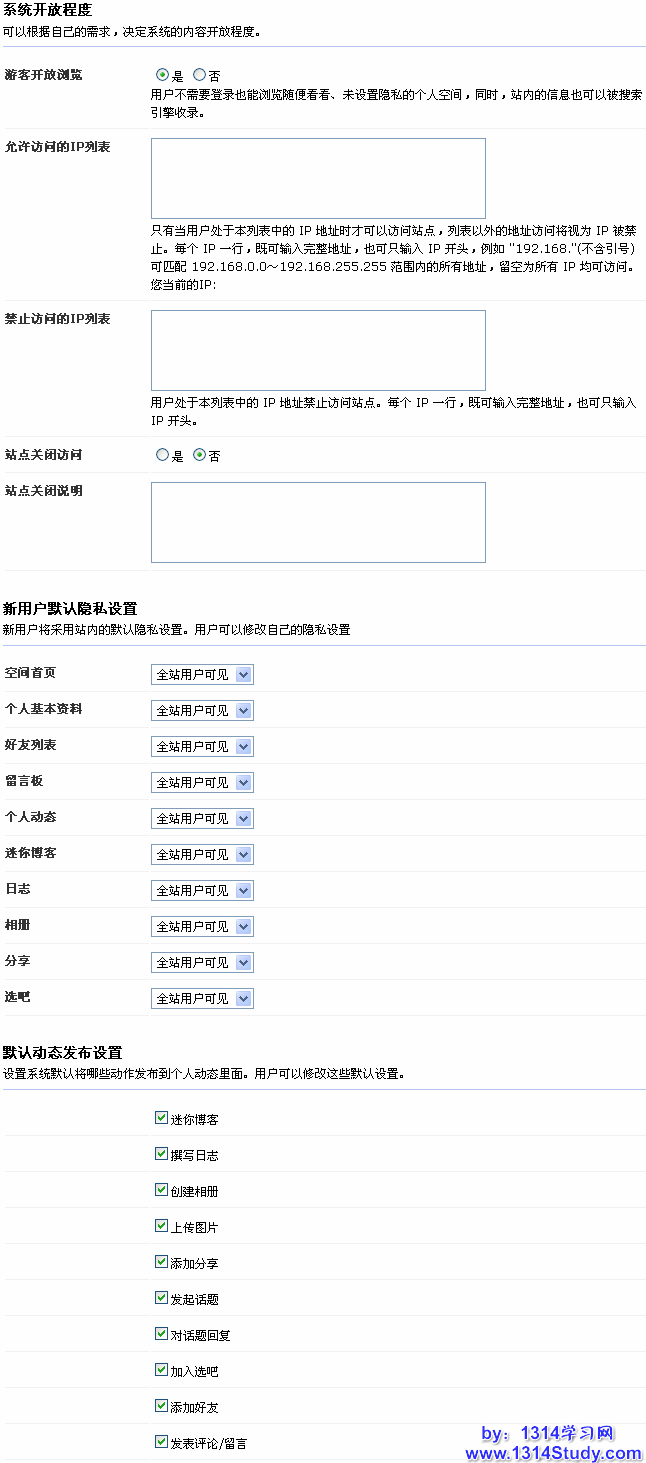 UCenter Home 后台 => 常规设置 => 隐私设置