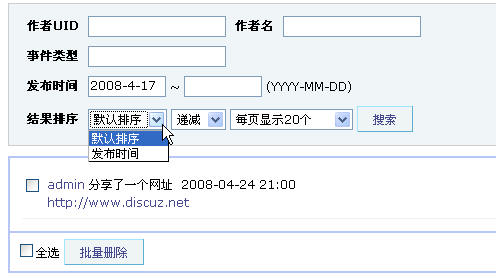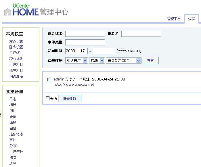 点击 UCHome 管理中心的批量管理 => 分享,可以看到如下图所示的界面: