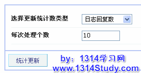 更新统计的选项有:日志回复数、空间好友数、空间好友缓存、选吧成员数、话题回复数、相册图片数、标签日志数。可以设置每次处理的数据条数,设置界面如下图: