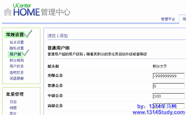 下面详细讲解下 UCenter Home 的用户组机制以及如何添加和编辑用户组,进入 UCHome 后台 => 常规设置 => 用户组: