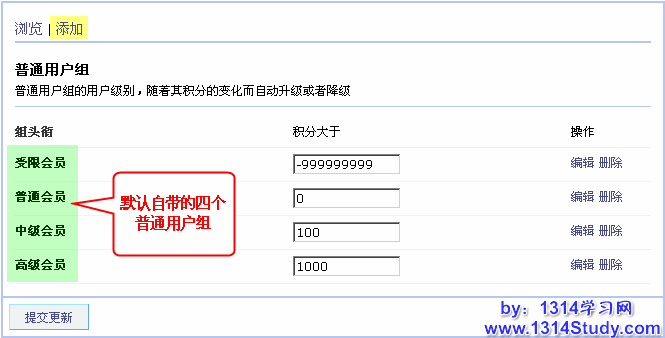 普通用户组的用户级别,随着其积分的变化而自动升级或者降级。系统默认自带的普通用户组有以下四个:受限会员、普通会员、中级会员、高级会员。如下图所示: