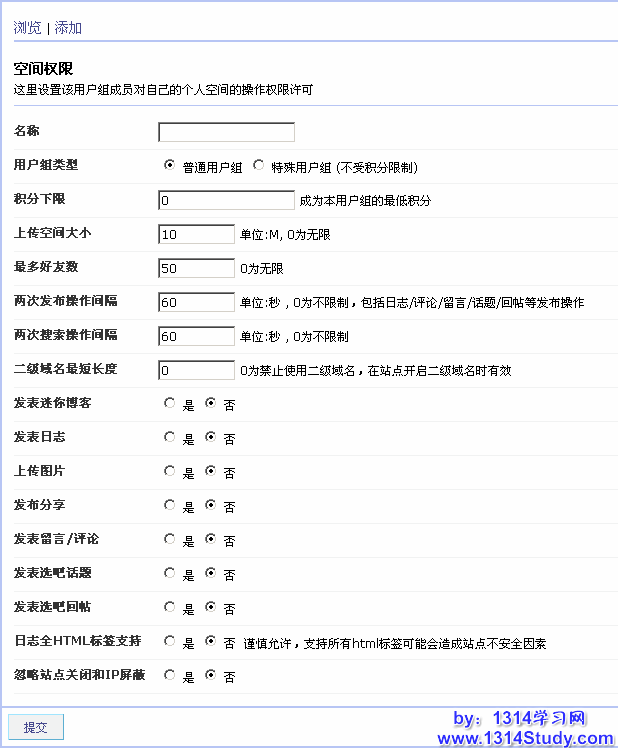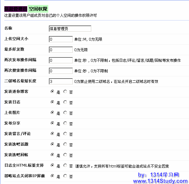 4、上传空间大小:该用户组可以在其空间上传附件的大小,单位为 M,0 为无限;