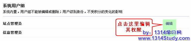 站长可以根据需求编辑这两个系统用户组的管理权限,下图中点击“编辑”即可: