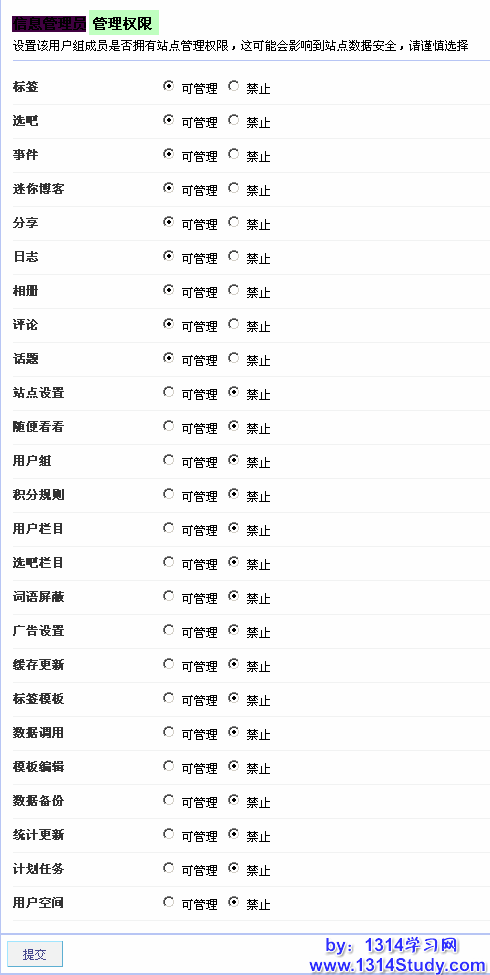 可在此设置该系统用户组是否可管理“标签”、“选吧”、“事件”、“迷你博客”、“分享”、“日志”、“相册”、“评论”、“话题”、“站点设置”、“随便看看”、“用户组”、“积分规则”、“用户栏目”、“选吧栏目”、“词语屏蔽”、“广告设置”、“缓存更新”、“标签模板”、“数据调用”、“模板编辑”、“数据备份”、“统计更新”、“计划任务”、“用户空间”操作。