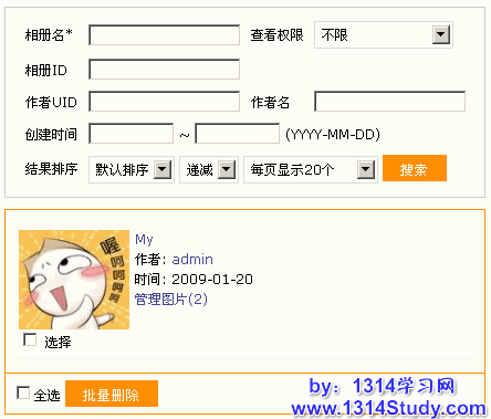 可以根据 相册名、查看权限、相册id、作者uid、作者名、创建时间范围以及排序方式中的一个或者几个搜索出想要的数据。