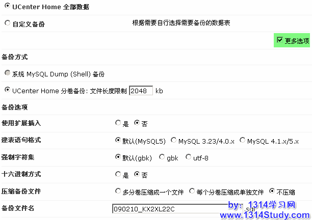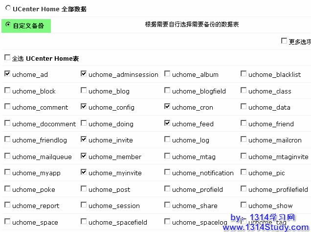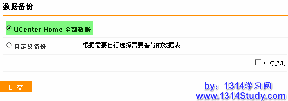 默认选择“UCenter Home 全部数据”直接提交就可以了,点击更多选项,可以根据这里的条件进行备份