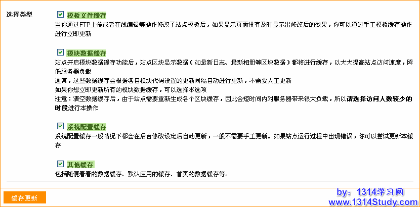 顾名思义,更新 UCenter Home 的缓存文件及有关数据表的数据。在 UCenter Home 的后台 -> 高级应用 -> 缓存更新,提供了四种更新缓存的类型:模板文件缓存、模板数据缓存、系统配置缓存、其他缓存。如下图所示:
