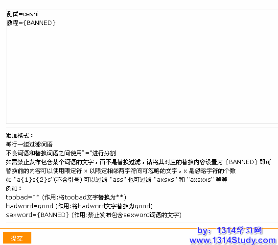 1、添加格式:每行一组过滤词语;不良词语和替换词语之间使用“=”进行分割;如需禁止发布包含某个词语的文字,而不是替换过滤,请将其对应的替换内容设置为 {BANNED} 即可;替换前的内容可以使用限定符 x 以限定相邻两字符间可忽略的文字,x 是忽略字符的个数;如 "a{1}s{2}s"(不含引号) 可以过滤 "ass" 也可过滤 "axsxs" 和 "axsxxs" 等等。