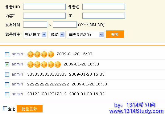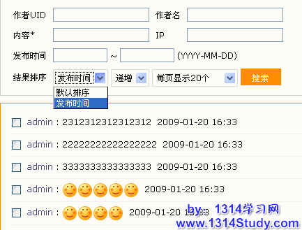 1、搜索:可以按照作者 UID 、作者名、部分记录内容、发表记录的 IP 、发布时间进行搜索,搜索的结果可以设置显示的排序。例如:按照发帖时间、递增、递减、每页显示数进行查看。