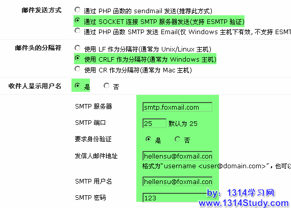 3、邮件发送方式选择通过 SOCKET 连接 SMTP 服务器发送,邮件头的分隔符选择使用 CRLF 作为分隔符,然后填写相关 SMTP 服务器信息,如下图所示: