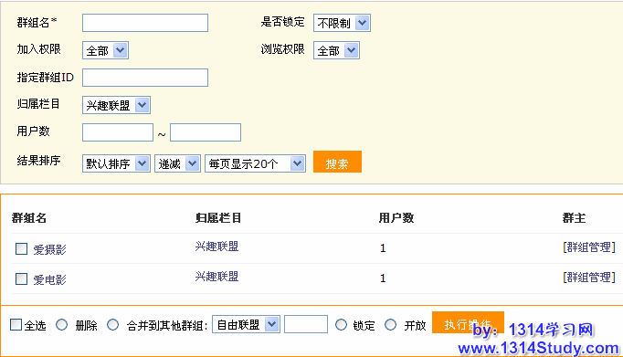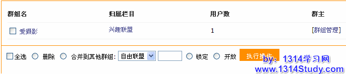 在后台管理员可以对群组进行管理,后台进入管理群组页面:登录 UCenter Home => 设置 => 高级管理 => 批量管理 => 群组,如下图所示: