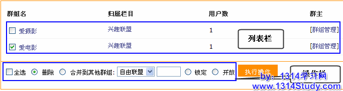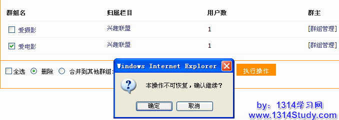 选择上图中列表栏中的需要删除的群组名,然后再选择操作栏中一个删除按钮,最后点击“执行操作”按钮即可进行批量删除。如下图所示: