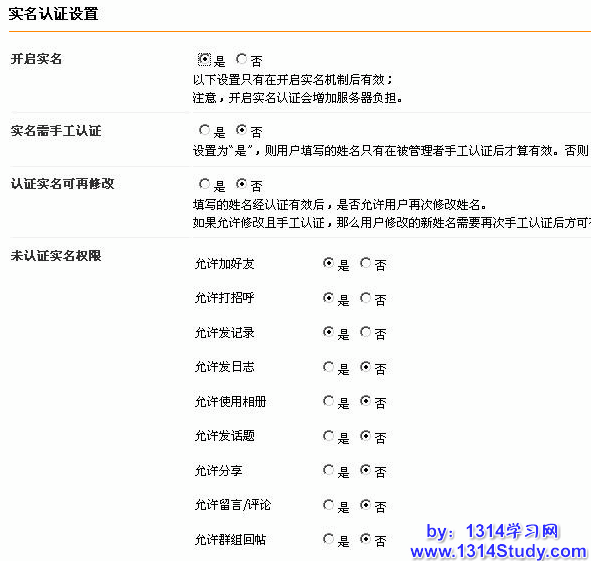 UCenter Home 后台 => 基本设置 => 站点设置 => 实名认证设置