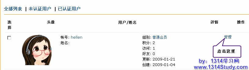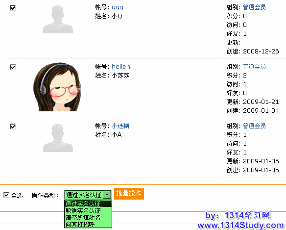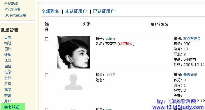 后台管理实名认证功能所在位置:UCenter Home 后台 => 批量管理 => 实名认证