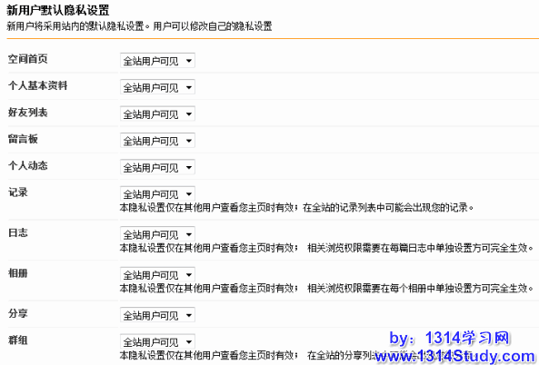 新用户将采用站内的默认隐私设置。用户可以修改自己的隐私设置。如下图所示: