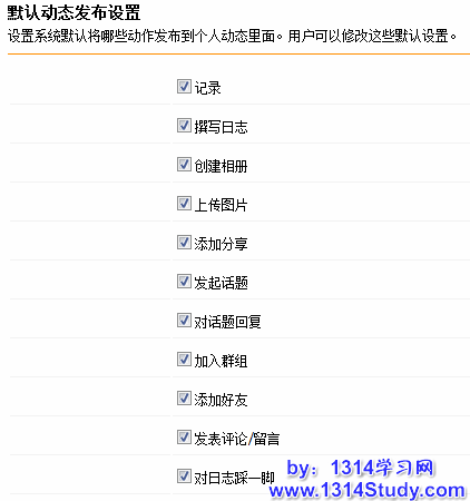 设置系统默认将哪些动作发布到个人动态里面。用户可以修改这些默认设置。如下图所示: