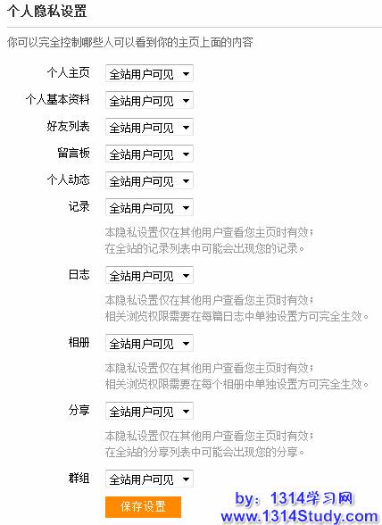个人动态,记录,日志,相册,分享项可以设置的权限有:全站用户可见、仅好友可见。
