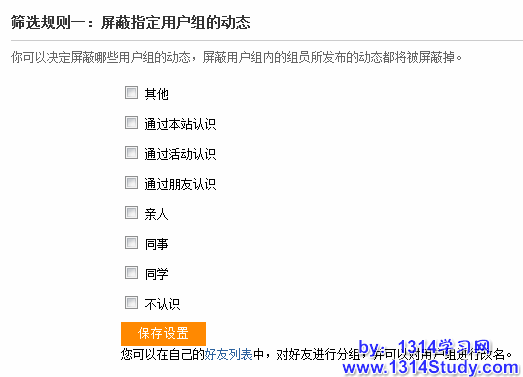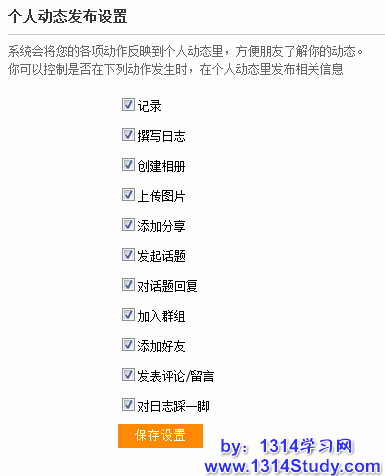 这里可以针对发表记录、撰写日志、创建相册、上传图片、添加分享、发起话题、对话题回复、加入群组、添加好友、发表评论/留言、对日志踩一脚这些动作是否产生动态做详细的控制。