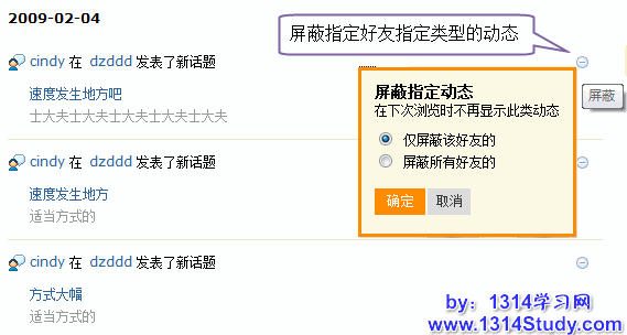 点击一下首页好友动态列表后面的屏蔽标志,就可以屏蔽指定好友指定类型的动态了。如下图所示: