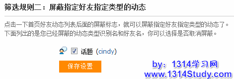 这里显示的则为我屏蔽了用户名为 cindy 这个用户的类型为“话题”的所有动态。
