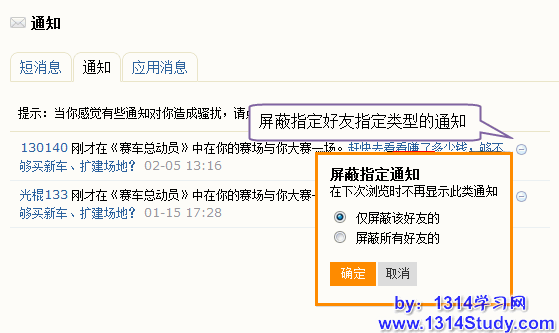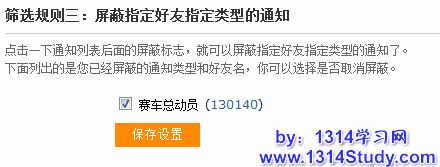 点击屏蔽后,弹出一个选择框,在这里可以选择“仅屏蔽该好友的”或是“屏蔽所有好友的”指定类型的通知,点击提交即可。在“筛选规则三”下面列出的是您已经屏蔽的通知类型和好友名,你可以选择是否取消屏蔽。如下图所示: