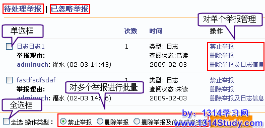 UCenter Home 后台 => 批量设置 => 举报管理,即可看到下图所示: