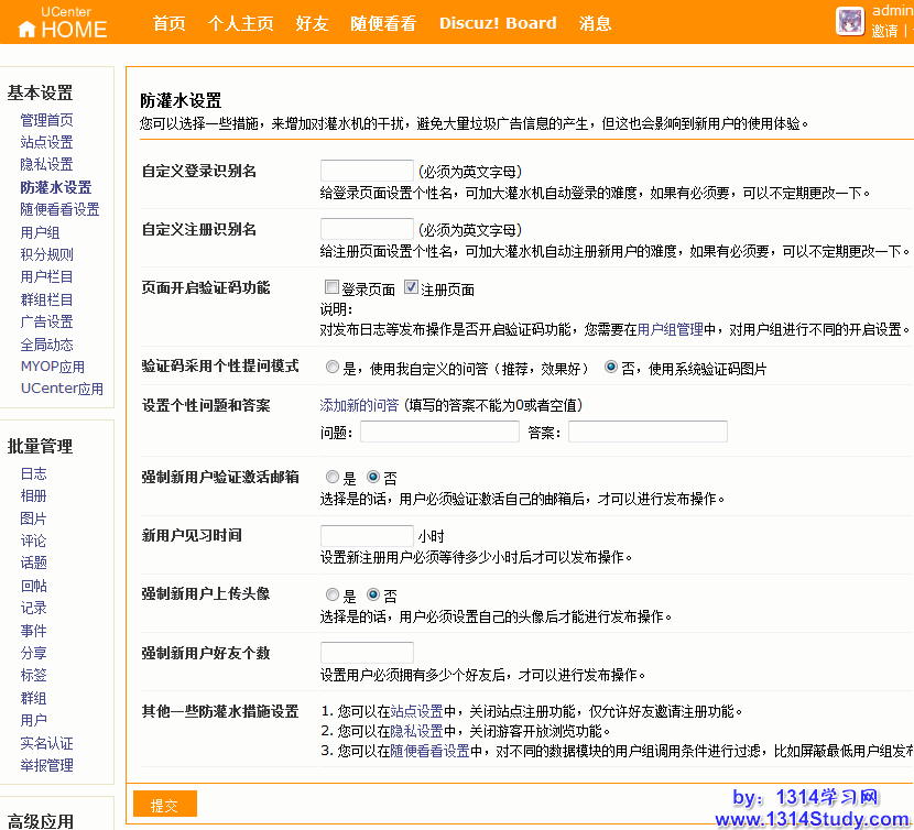 UCenter Home 首页 => 设置 => 高级管理(输入密码进入后台)=> 基本设置 => 防灌水设置: