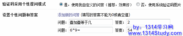“是,使用我自定义的问答(推荐,效果好)”:选择这种模式则验证码是问答模式,需要管理员在后台提前设置好个性问题和答案,举例如下图所示设置: