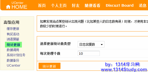 登录 UCenter Home => 设置 => 高级管理 => 高级应用 => 统计更新,如下图所示: