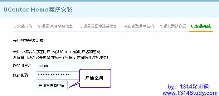 4、输入用户名和密码,系统将这个用户名设为 UCenter Home 管理员,并开通管理员空间。