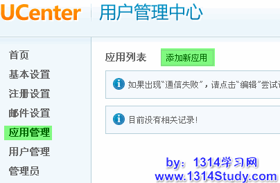 1、进入 UCenter 后台 => 应用管理 => 添加新应用,如下图所示:
