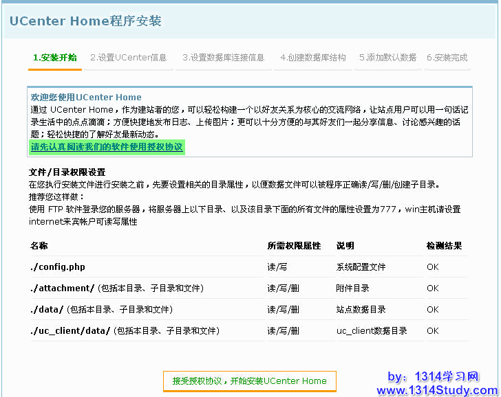 接受授权协议,开始安装 UCenter Home