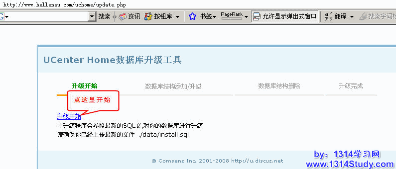 将 update 目录中的 update.php 上传到根目录,并在浏览器运行。即如果你的 UCenter Home 访问地址为 http://www.domain.com,则运行 http://www.domain.com/update.php,如下图所示: