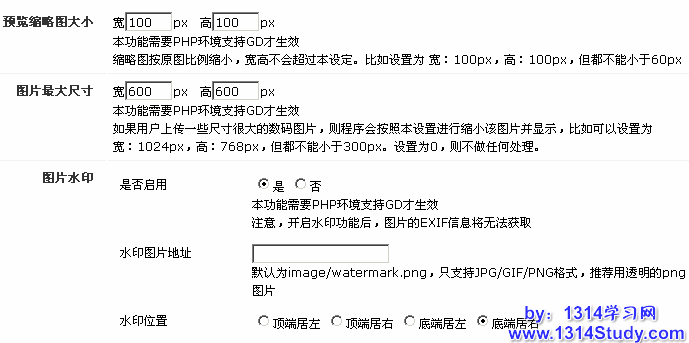 图片水印:选择“是”开启图片水印功能,这里也需要 PHP 环境支持 GD 才生效。