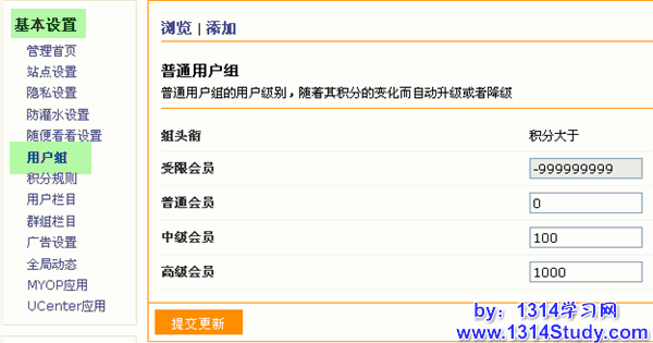 下面详细讲解下 UCenter Home 的用户组机制以及如何添加和编辑用户组,进入 UCHome 后台 => 基本设置 => 用户组: