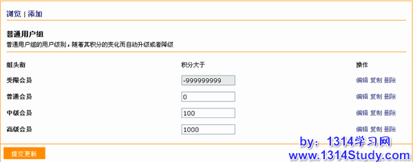 普通用户组的用户级别,随着其积分的变化而自动升级或者降级。系统默认自带的普通用户组有以下四个:受限会员、普通会员、中级会员、高级会员。如下图所示: