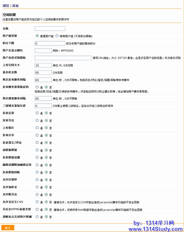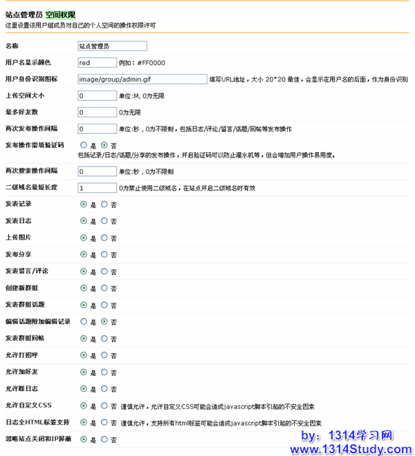 6、上传空间大小:该用户组可以在其空间上传附件的大小,单位为 M,0 为无限;