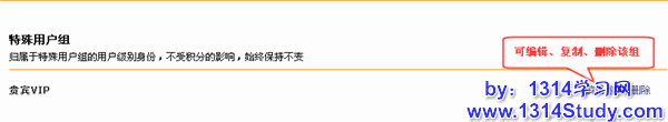 系统用户组默认自带一个名为“贵宾VIP”的组,站长可以根据自己的需求添加和编辑特殊用户组的权限,特殊用户组的添加和编辑方法类似于普通用户组的添加和编辑方法,这里将不再赘述。