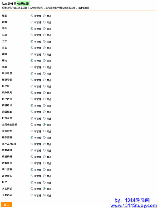 可在此设置该系统用户组是否可管理“标签”、“选吧”、“事件”、“迷你博客”、“分享”、“日志”、“相册”、“评论”、“话题”、“站点设置”、“随便看看”、“用户组”、“积分规则”、“用户栏目”、“选吧栏目”、“词语屏蔽”、“广告设置”、“缓存更新”、“标签模板”、“数据调用”、“模板编辑”、“数据备份”、“统计更新”、“计划任务”、“用户空间”操作。
