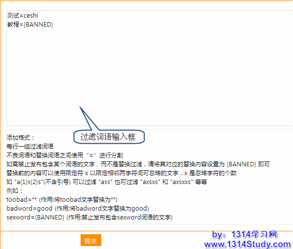 每行一组过滤词语;不良词语和替换词语之间使用“=”进行分割;如需禁止发布包含某个词语的文字,而不是替换过滤,请将其对应的替换内容设置为 {BANNED} 即可;替换前的内容可以使用限定符 x 以限定相邻两字符间可忽略的文字,x 是忽略字符的个数;如 "a{1}s{2}s"(不含引号) 可以过滤 "ass" 也可过滤 "axsxs" 和 "axsxxs" 等等。