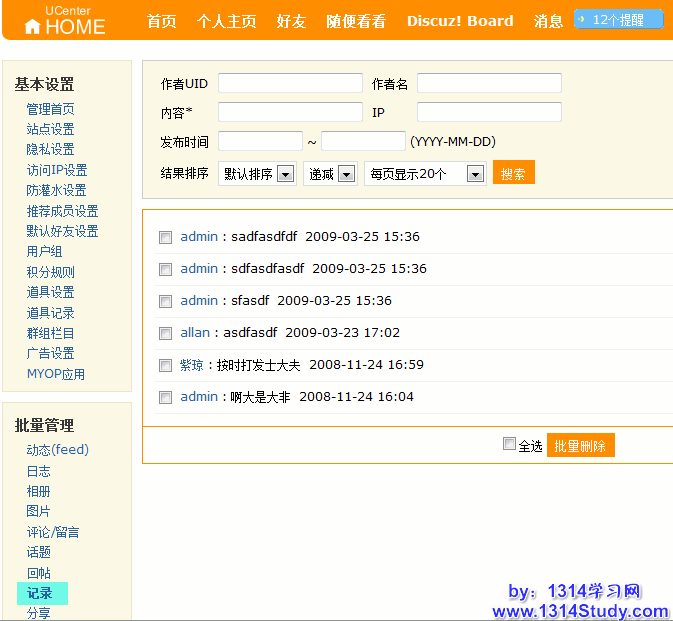 登录 UCenter Home 首页 => 设置 => 高级管理 => 批量管理 => 记录,可在此批量删除记录。