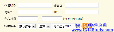已有的搜索条件有:作者 UID 、作者名、部分记录内容、发表记录的 IP 、发布时间进行搜索,搜索的结果可以设置显示的排序,例如按照发帖时间、递增、递减、每页显示数进行查看。