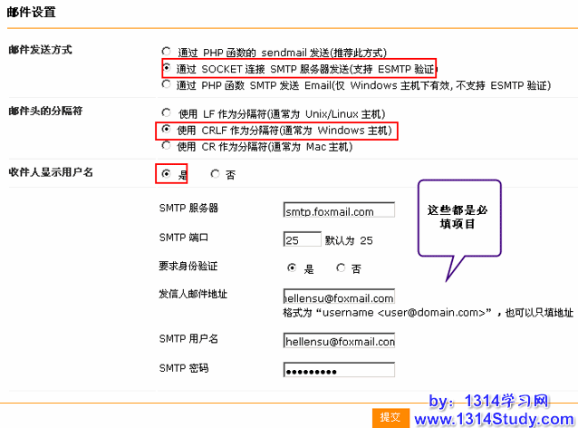 3、邮件发送方式选择通过 SOCKET 连接 SMTP 服务器发送,邮件头的分隔符选择使用 CRLF 作为分隔符,然后填写相关 SMTP 服务器信息。