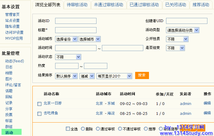 登录 UCenter Home => 设置 => 高级管理 => 批量管理 => 活动,即可看到下图所示: