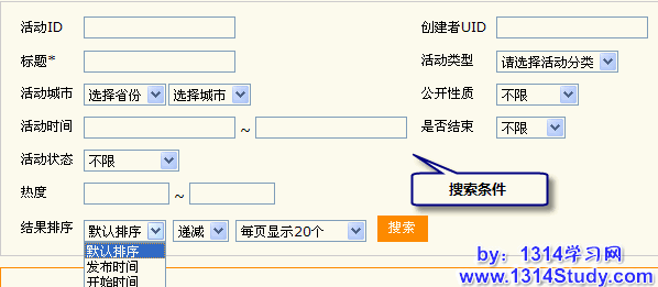 站长可以在管理后台设置一定的搜索条件来搜索活动,可以设置的搜索条件有活动ID、创建者ID、标题、活动类型、活动城市、活动时间范围等,并可以设置搜索搜索结果的排序。如下图: