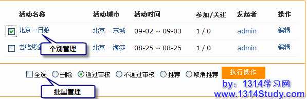 在 UCenter Home 2.0 中,用户可以在前台发起活动,站长可以在后台批量管理这些活动。