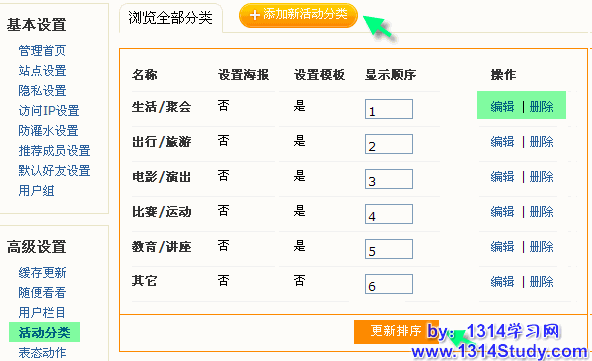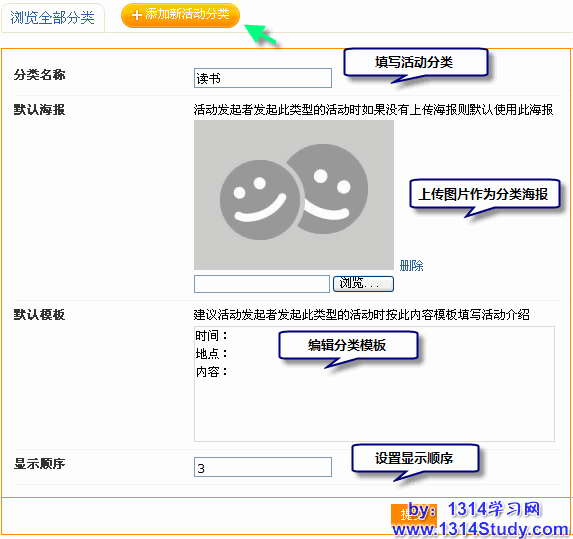 如果内置的分类不满足站点的需求,站长可以自行添加新的活动分类。在活动分类页面点击“添加新活动分类”按钮,填入新的活动分类的活动名称、默认海报、默认模板、显示顺序等信息后,点击提交即可建立新的活动分类。