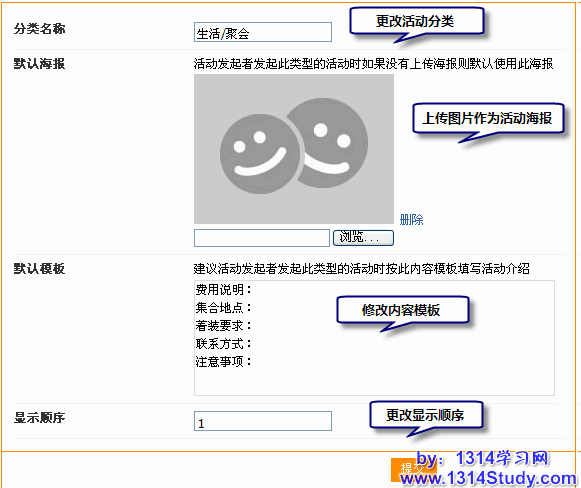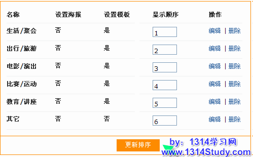在分类后可以选择编辑或删除。编辑时,可以对该项活动分类的分类名称、默认海报、默认模板、显示顺序进行修改。