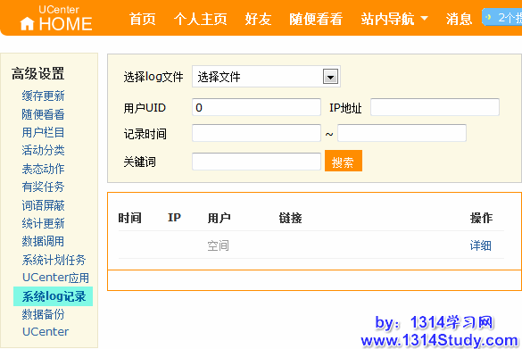 登录 UCenter Home 2.0 前台 => 设置 => 高级管理 => 高级设置 => 系统log记录: