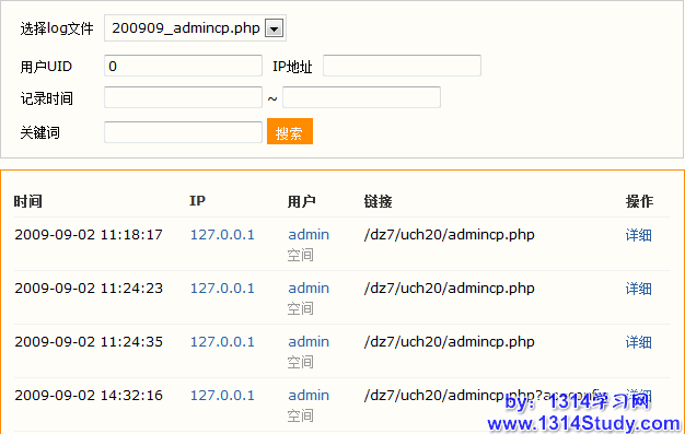 可以在此根据一定的条件搜索特定系统 log 记录,搜索条件包括:选择 log 文件、用户UID、IP地址、记录时间、关键词。